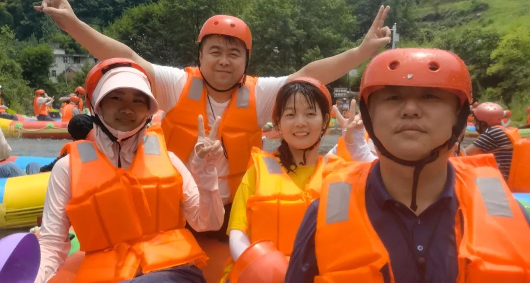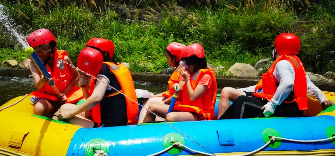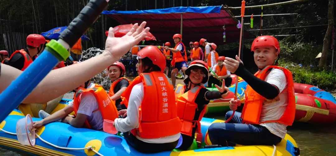 七月的大別山綠野芬芳,滿目青翠,景色秀麗,在負氧離子滿滿的霍山大峽谷里,隊員們開始了第二天精彩刺激的“霍山大峽谷漂流”活動。在兩岸山勢崔巍,翠竹披巒,白云崖崢的自然美景中,在九曲十彎,水清石藍、飛珠濺玉的漂流河道里,隊員們一邊享受自然美景帶來的愜意感,一邊享受巨大落差帶來的刺激感。隊員們“駕駛”漂流艇,你追我趕,在平坦處“相撞”戲水激戰(zhàn),飛濺的河水浸透了衣服,卻點燃了隊員們滿滿的熱情。