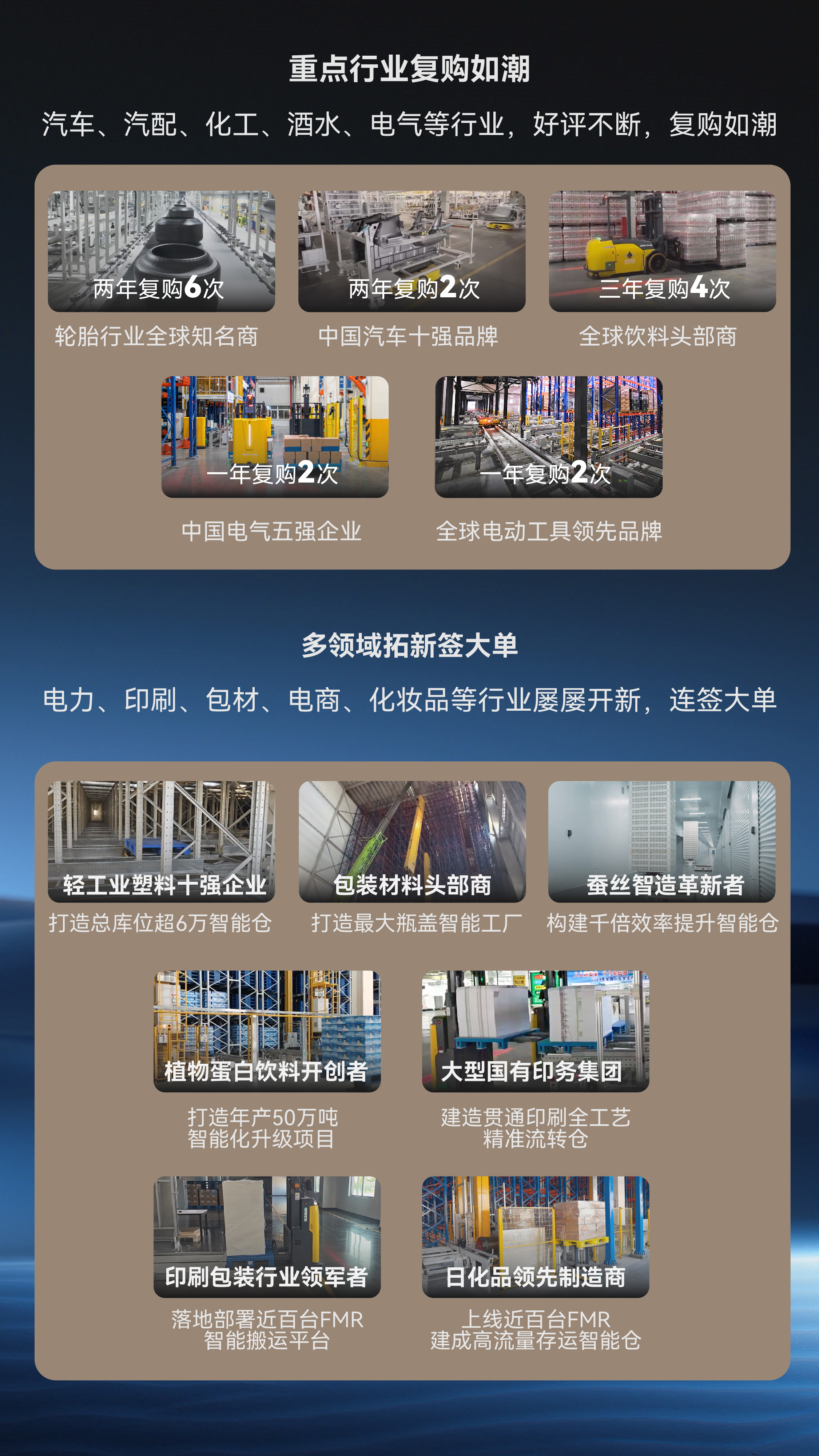 牽手中國輕工業(yè)塑料十強(qiáng)企業(yè),打造總庫位超6萬智能倉;牽手包裝材料頭部商,打造最大瓶蓋智能工廠;聯(lián)手大型國有印務(wù)集團(tuán);建造貫通印刷全工藝精準(zhǔn)流轉(zhuǎn)倉;牽手印刷包裝行業(yè)領(lǐng)軍者落地部署近百臺(tái)FMR智能搬運(yùn)平臺(tái);攜手蠶絲智造革新者,構(gòu)建千倍效率提升智能倉;攜手植物蛋白飲料開創(chuàng)者,打造年產(chǎn)50萬噸智能化升級(jí)項(xiàng)目;聯(lián)合日化品領(lǐng)先制造商,上線近百臺(tái)FMR建成高流量存運(yùn)智能倉