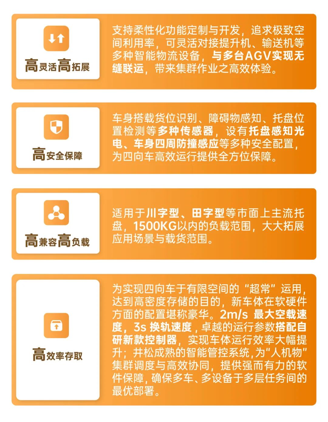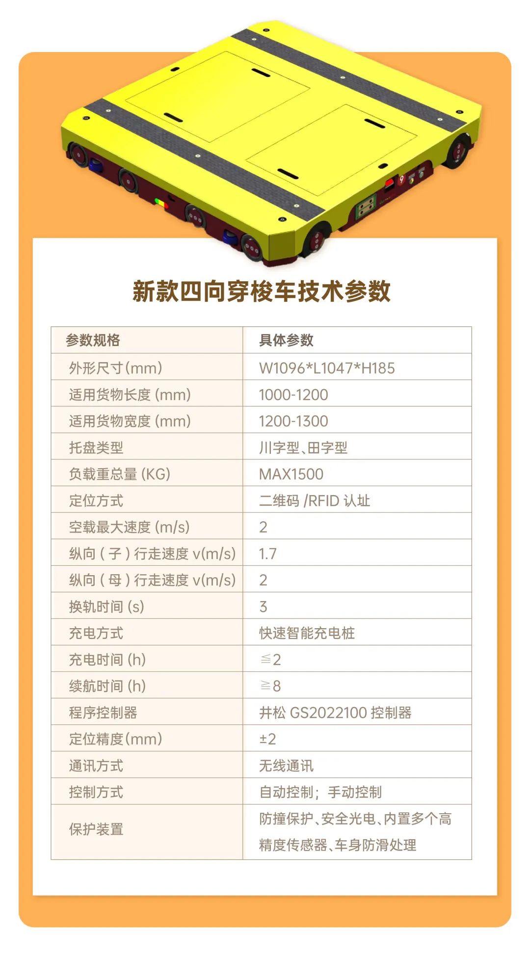 要解決上述問題,智能四向車立庫(kù)方案堪稱首選。該方案以托盤四向穿梭車為核心,通過智能物流技術(shù)與裝備,實(shí)現(xiàn)車體于貨架內(nèi)四向行駛和物料的高效存取,達(dá)到多場(chǎng)景靈活應(yīng)用、高密度存儲(chǔ)的目的。井松智能基于16載智能制造經(jīng)驗(yàn),提煉、總結(jié)大量軟硬件設(shè)備系統(tǒng)研制與應(yīng)用心得,重磅推出新一代四向穿梭車。
